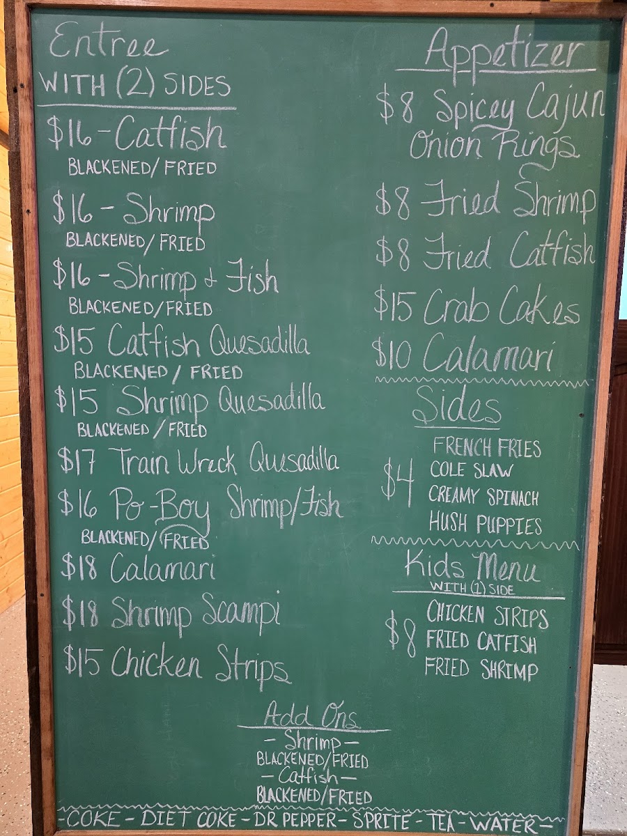 Blackened catfish, shrimp and hush puppies blended in a 10” quesadilla included two sides